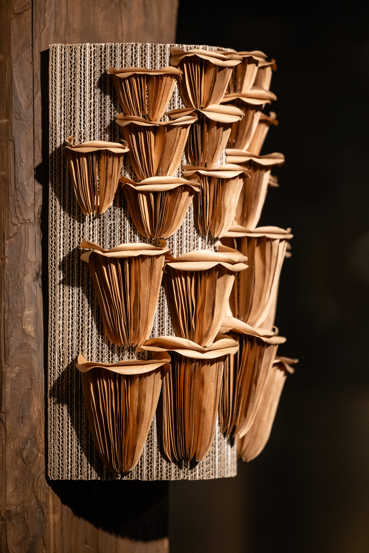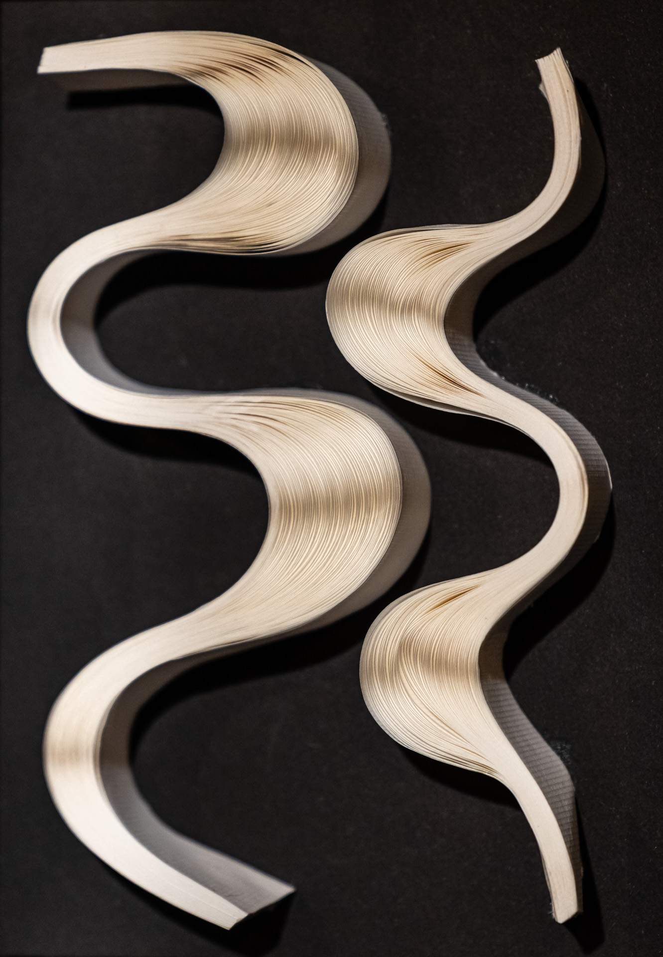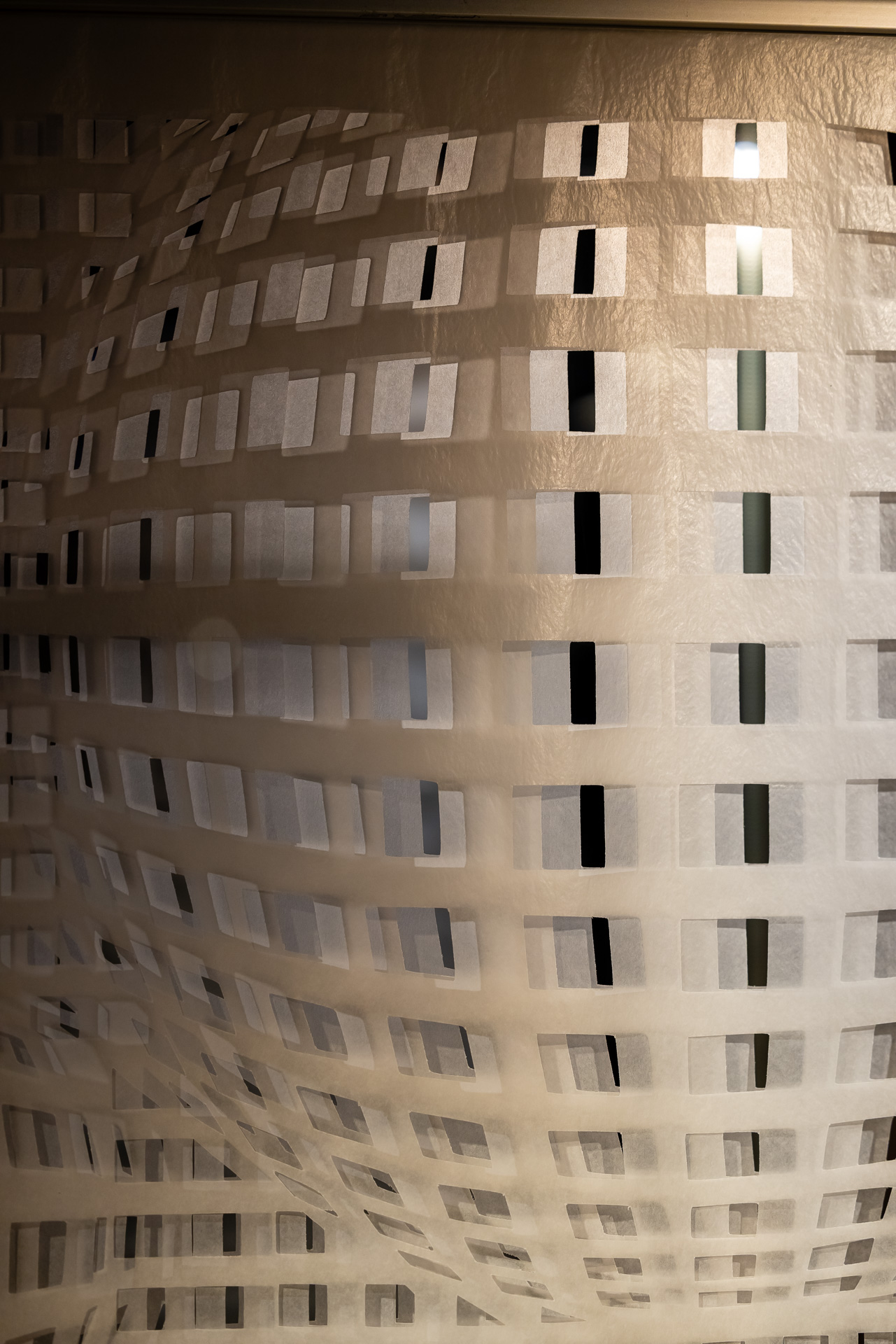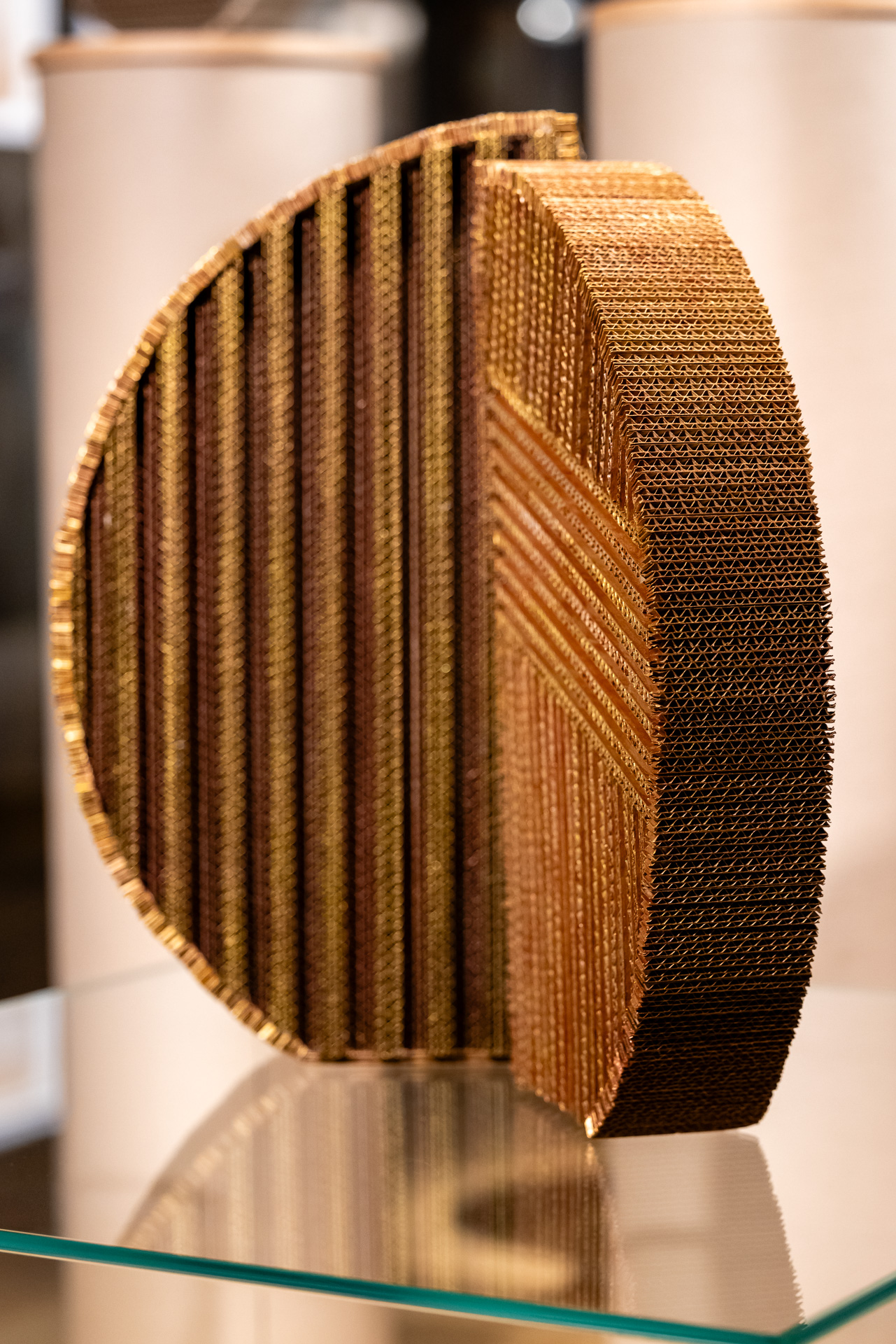 Delikatna bibułka tytoniowa miękko poddaje się wygięciom, zapraszając światło do gry refleksów, natomiast sztywność tektury falistej prowadzi do wyrazistej konstrukcji geometrycznej.