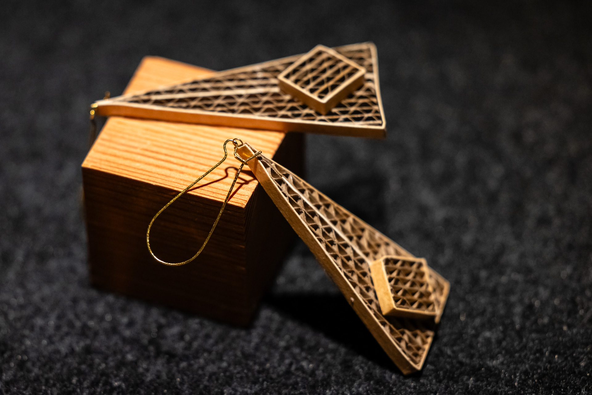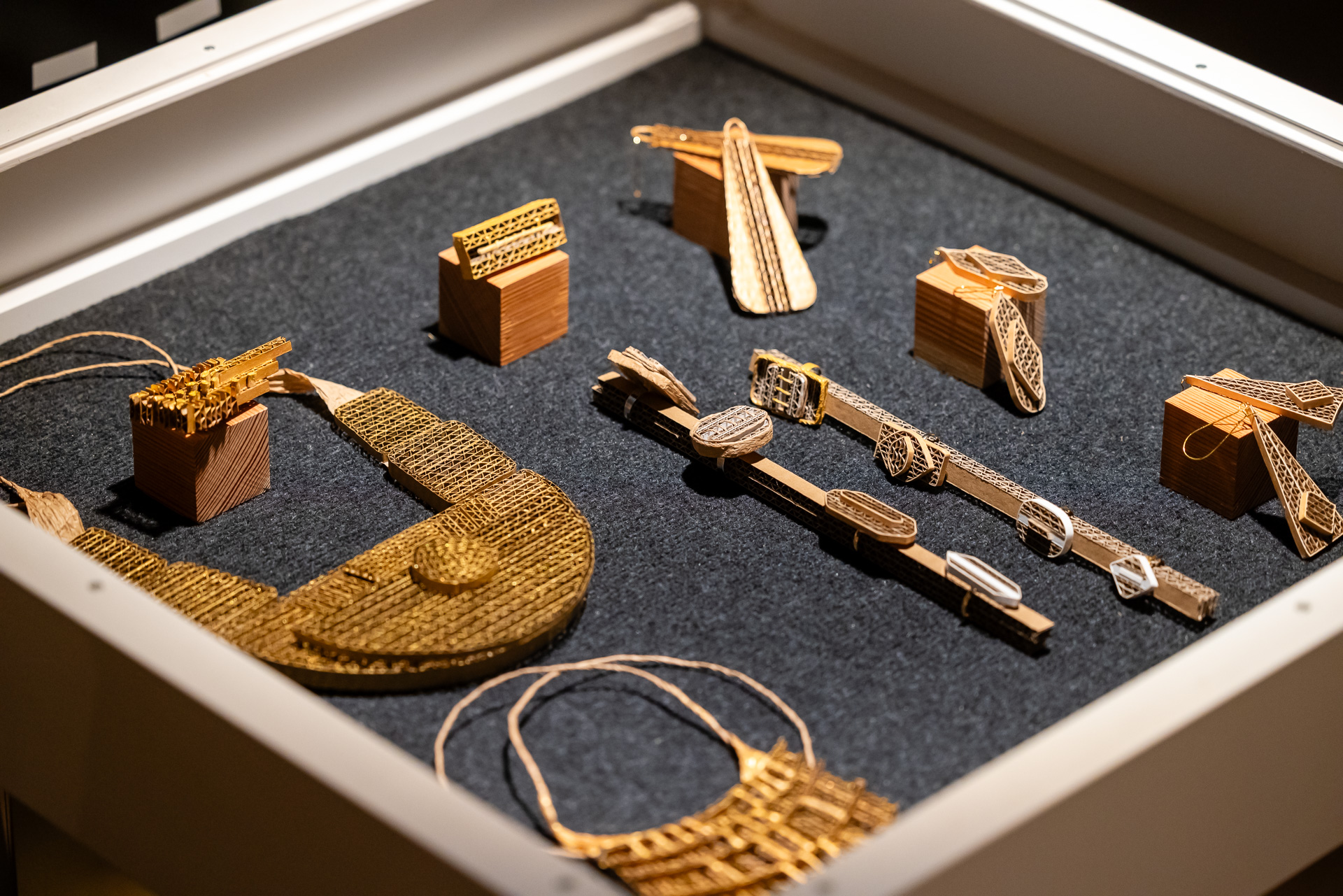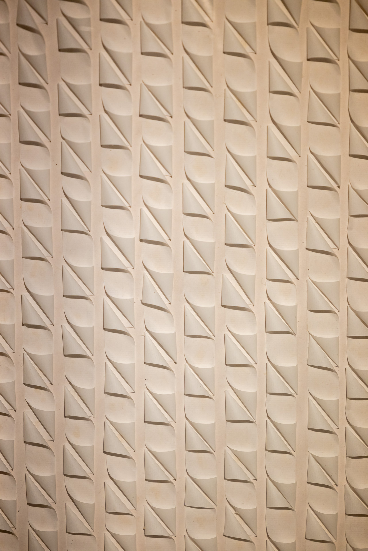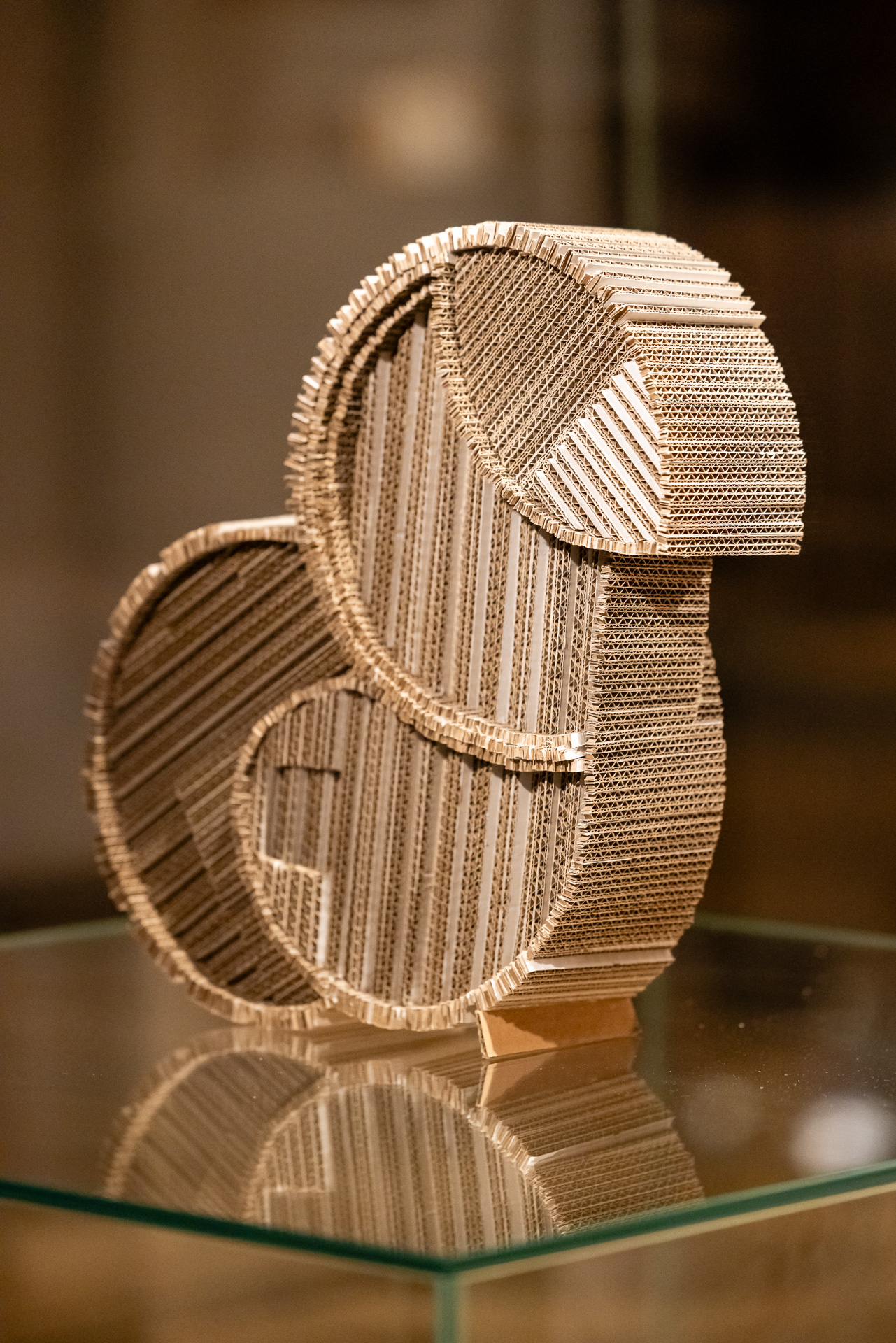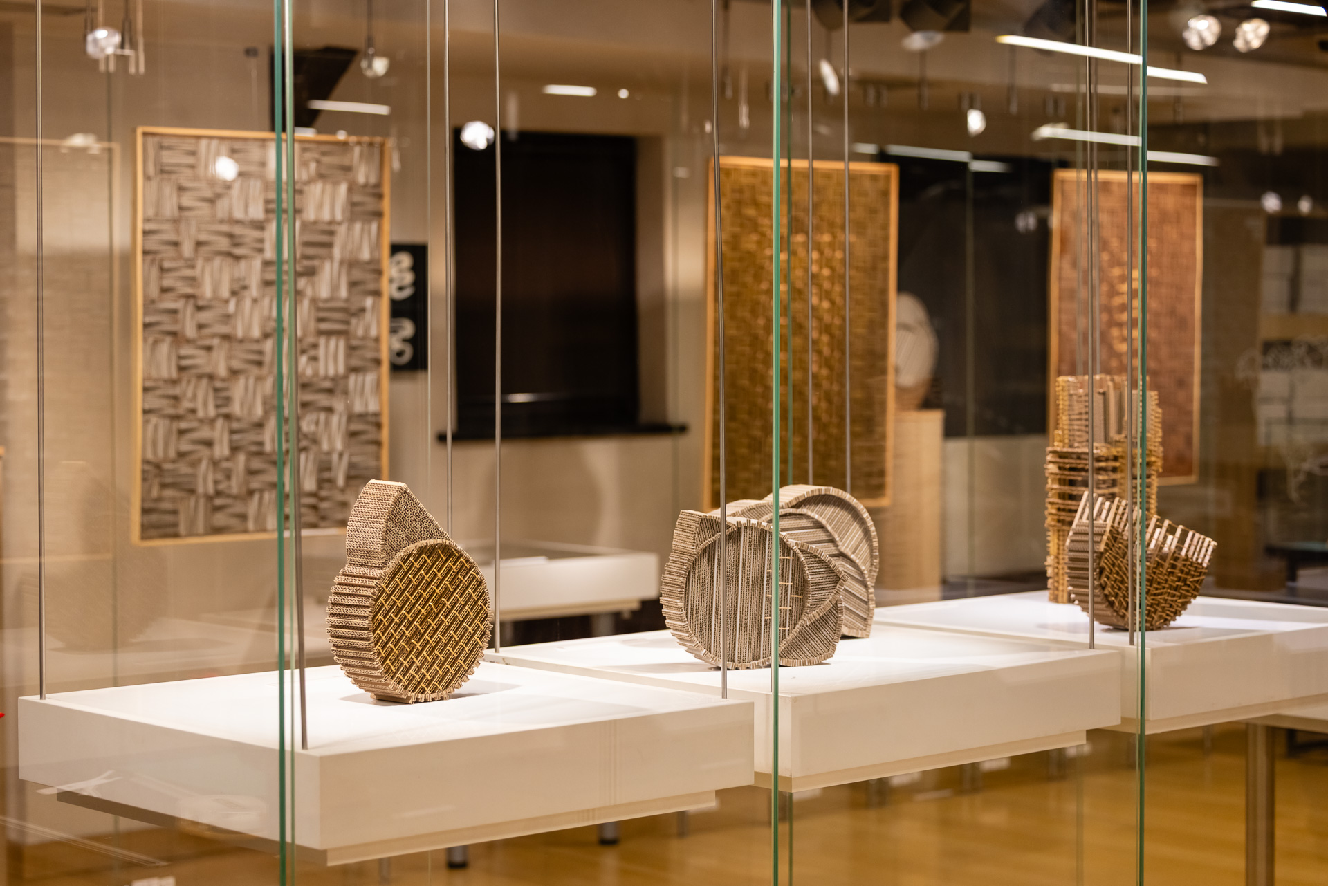 Delikatna bibułka tytoniowa miękko poddaje się wygięciom, zapraszając światło do gry refleksów, natomiast sztywność tektury falistej prowadzi do wyrazistej konstrukcji geometrycznej.