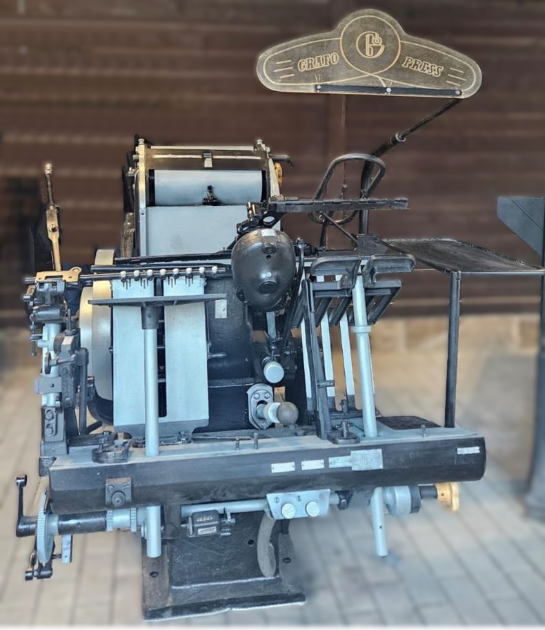 - maszynę drukarską Grafopress z 1960 r. do druku typograficznego z funkcją cięcia, numeracji, perforacji, bigowania i sztancowania;