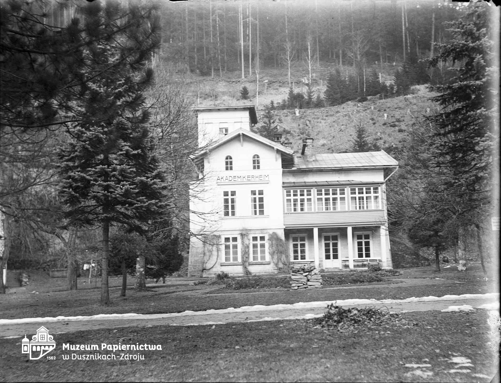 Zdjęcie na kliszy szklanej (negatyw), przedstawiające Akademikeheim im Kurhaus Villa Etelka im Schmelzetal (obecnie dom wczasowy Etolka w Stalowym Zdroju) na terenie Bad Reinerz (ob. Duszniki-Zdrój). Z kolekcji Ryszarda Grzelakowskiego. |