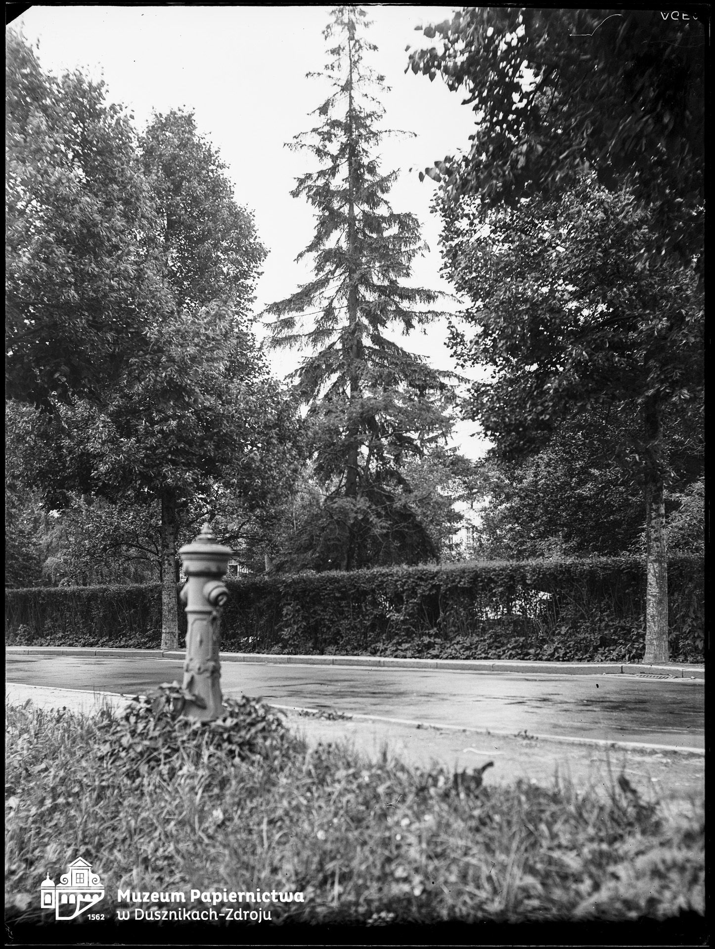 Zdjęcie na kliszy szklanej (negatyw), przedstawiające alejkę i hydrant w Bad Reinerz (Duszniki-Zdrój). Z kolekcji Ryszarda Grzelakowskiego. |