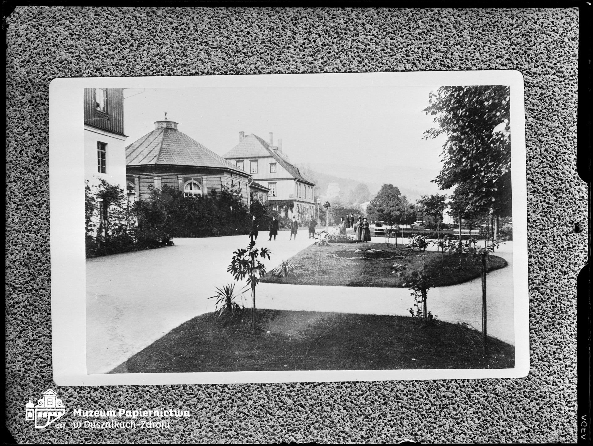Zdjęcie na kliszy szklanej (negatyw), przedstawiające Brunnenplatz (nieistniejący), Bad Reinerz (Duszniki-Zdrój). Widoczne nieistniejące już zabudowania: róg Doktorhaus, Pawilon Laue Quelle (Ciepłe źródło) oraz pensjonatu Schrothaus. Z kolekcji Ryszarda Grzelakowskiego. |
