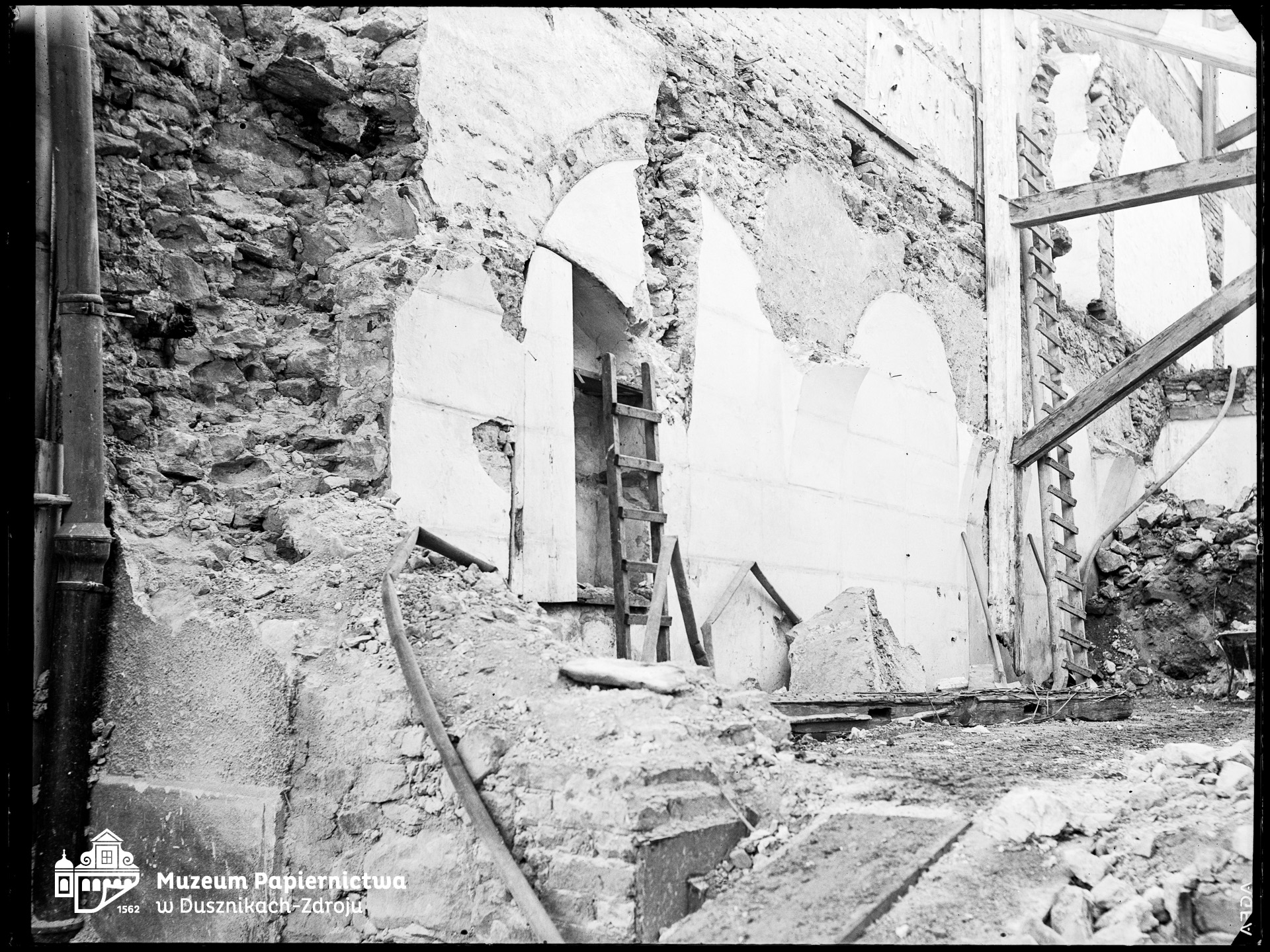 Zdjęcie na kliszy szklanej (negatyw) przedstawiające budynek podczas kapitalnego remontu, lokalizacja nieznana |