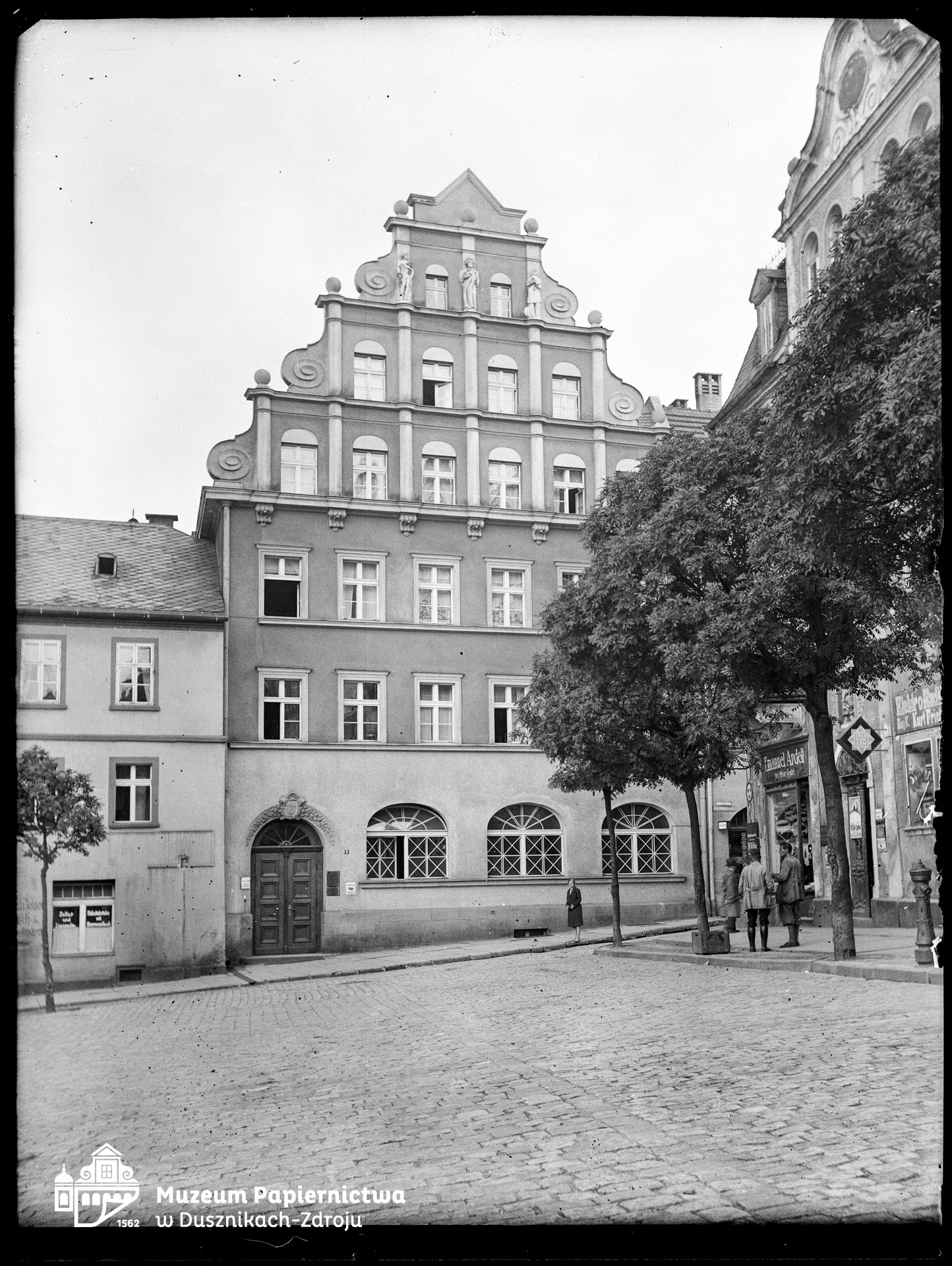 Zdjęcie na kliszy szklanej (negatyw), przedstawiające budynek Stadt Sparkassen w południowej pierzei rynku w Bad Reinerz (Duszniki-Zdrój, Rynek 4). Z kolekcji Ryszarda Grzelakowskiego. |