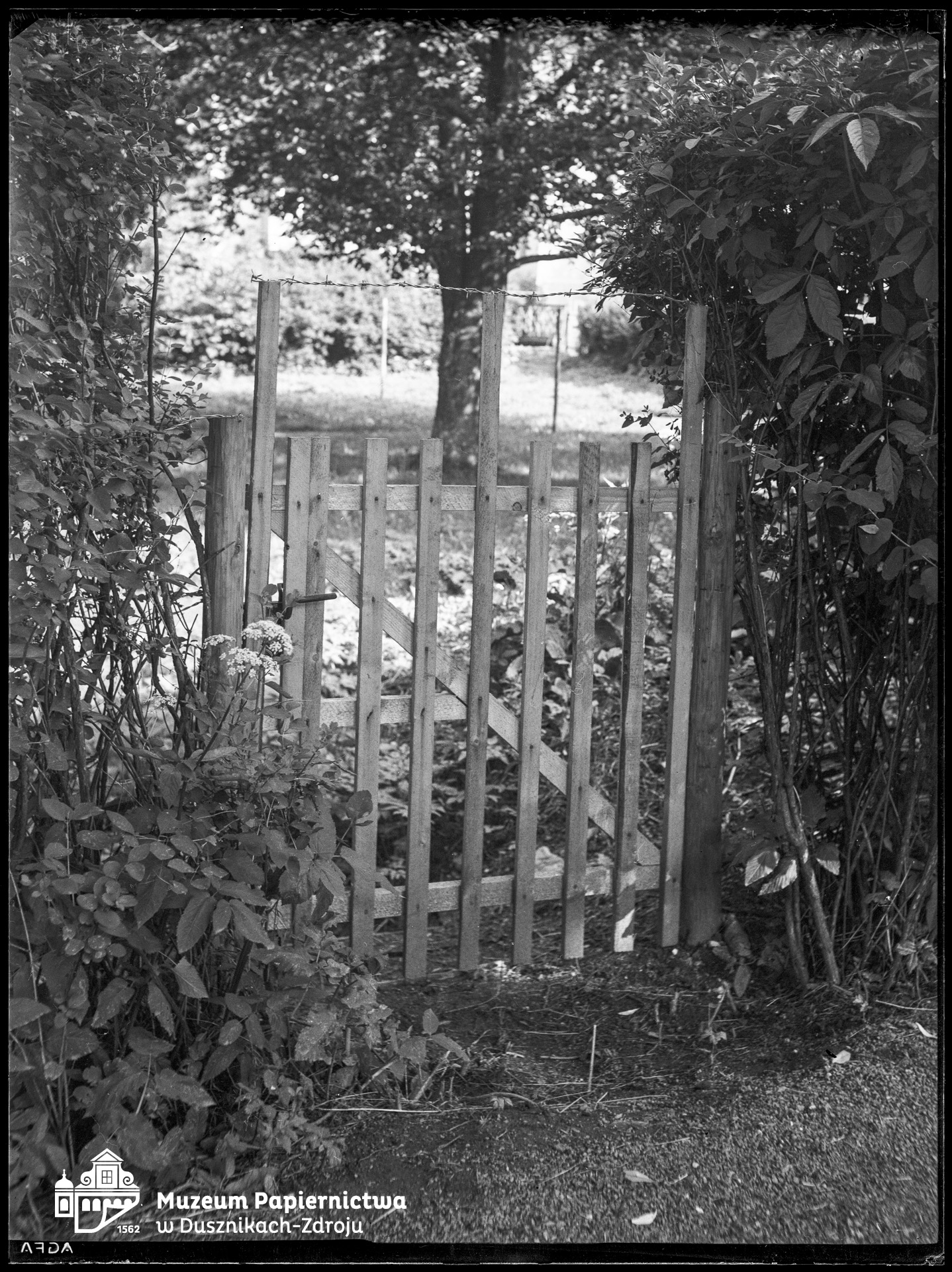 Zdjęcie na kliszy szklanej (negatyw), przedstawiające furtkę w płocie zamykającym ogród „Luisenhof” w kierunku ulicy Hindenburgufer w Bad Reinerz (Duszniki-Zdrój). Z kolekcji Ryszarda Grzelakowskiego. |
