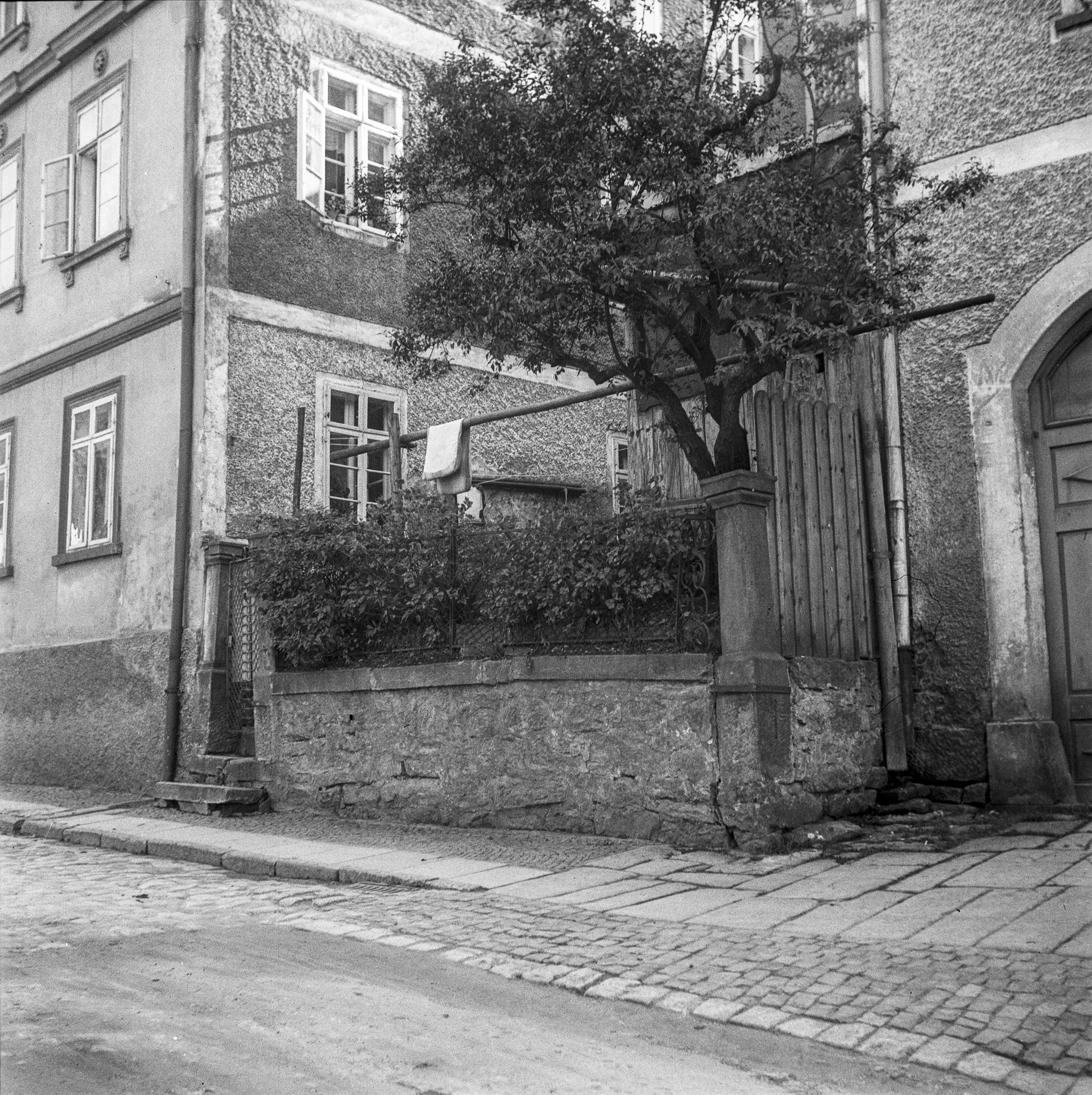 Zdjęcie na błonie fotograficznej (negatyw), przedstawiające fragment Heuscheuer Strasse (dzisiejszej ul. J. Słowackiego) w Bad Reinerz (Duszniki-Zdrój). Z kolekcji Ryszarda Grzelakowskiego. |