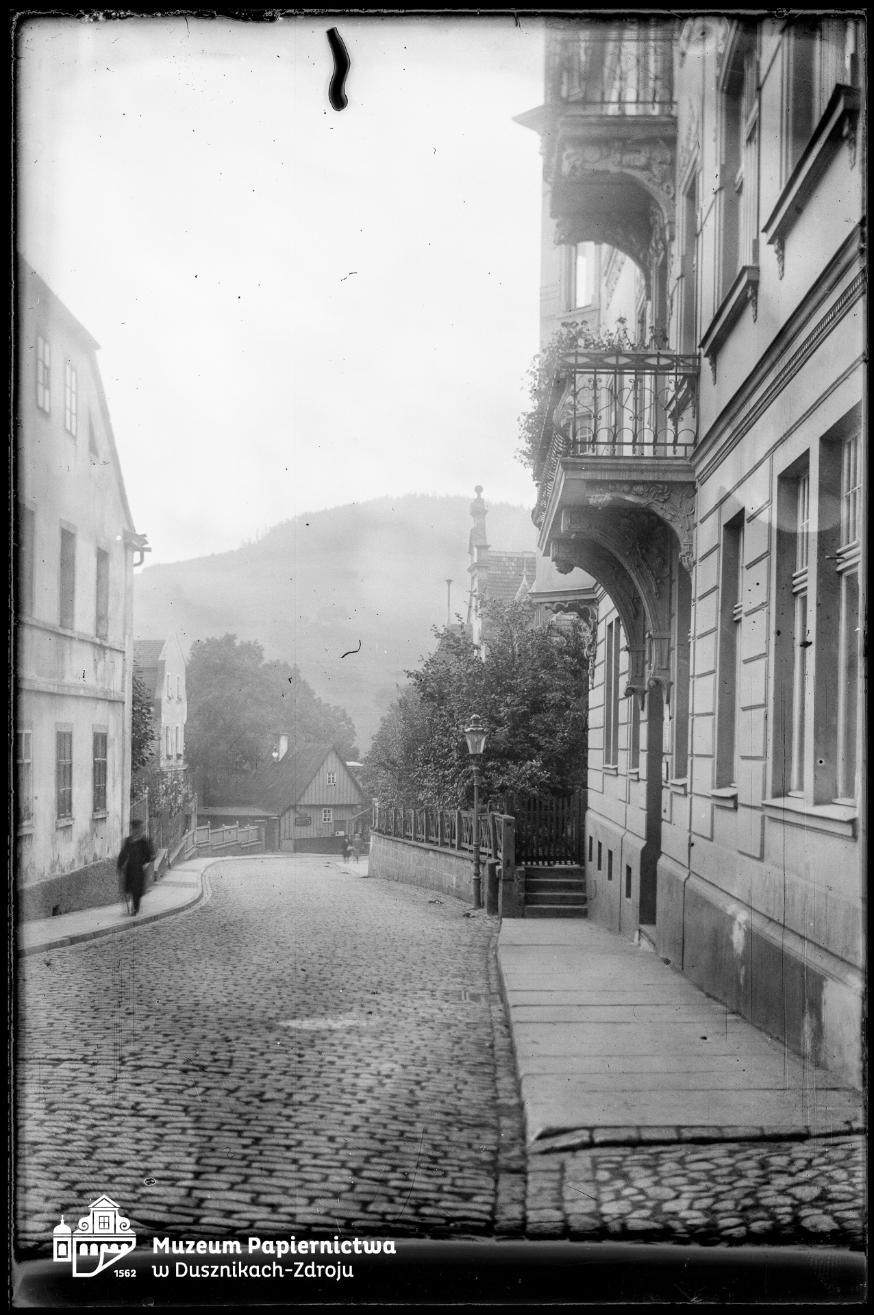 Zdjęcie na kliszy szklanej (negatyw), przedstawiające kamienicę czynszową mistrza murarskiego Benno Müllera przy Bade Strasse (obecnie ul. Mickiewicza 8) w Bad Reinerz (Duszniki-Zdrój). Z kolekcji Ryszarda Grzelakowskiego. |