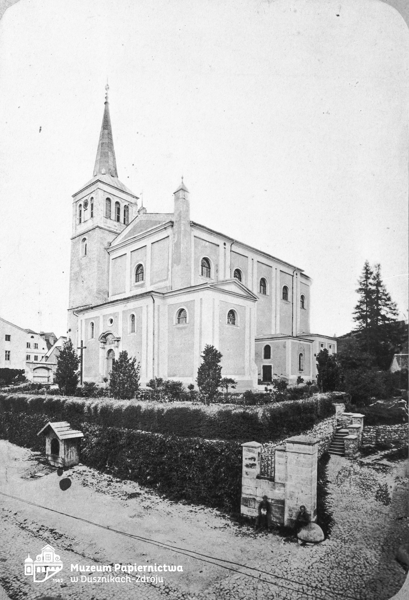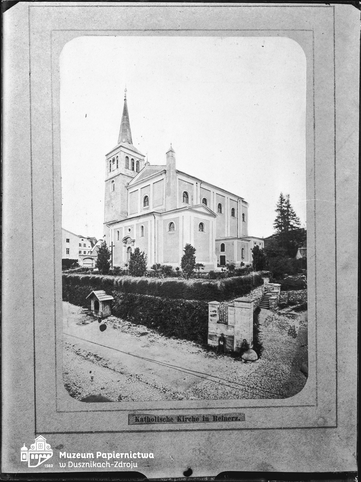 Zdjęcie na kliszy szklanej (negatyw), przedstawiające kościół katolicki pw. św. św. Piotra i Pawła w Bad Reinerz (ob. Duszniki-Zdrój) Z kolekcji Ryszarda Grzelakowskiego. |