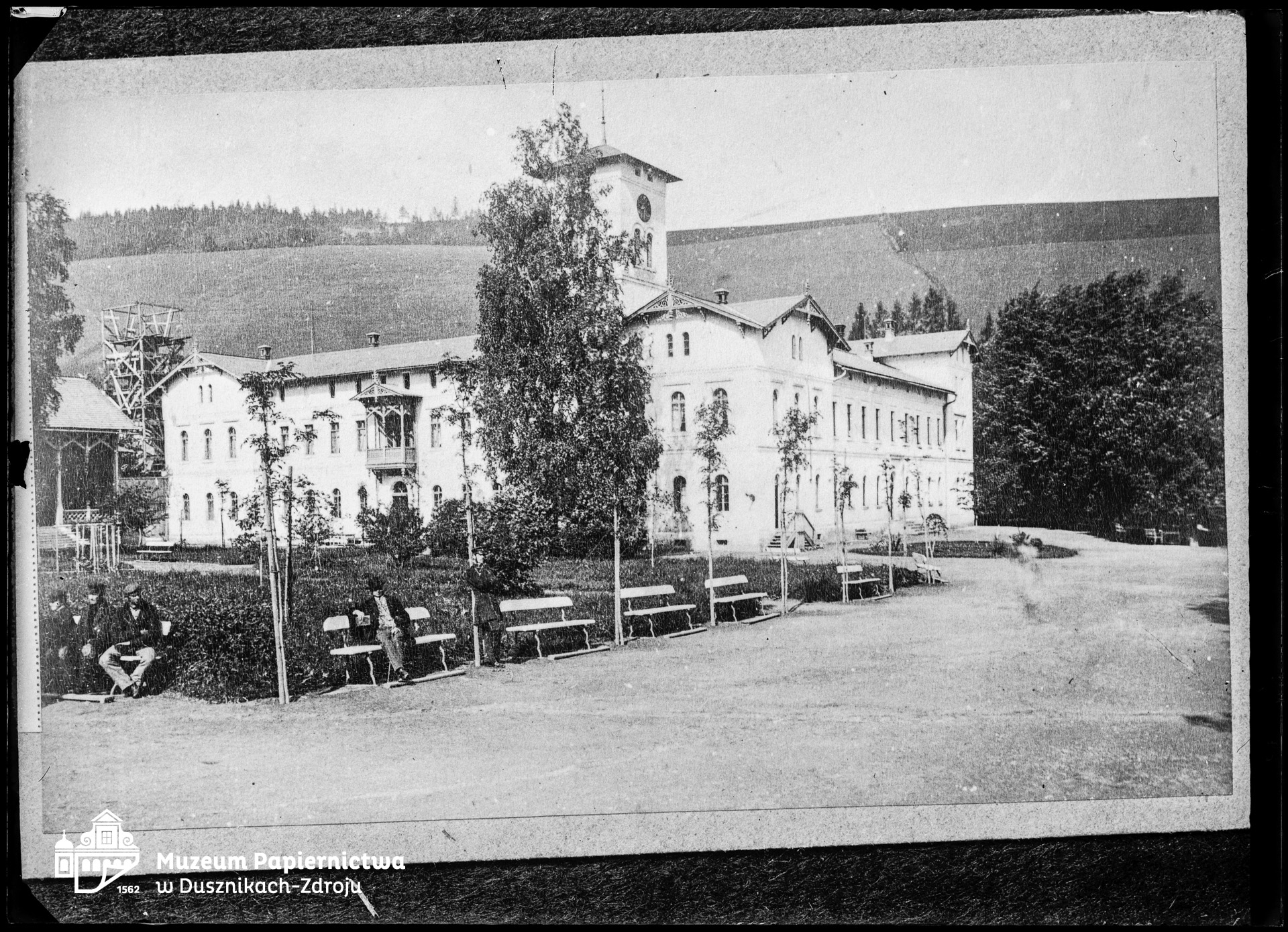 Zdjęcie na kliszy szklanej (negatyw), przedstawiające Kurhaus (ob. sanatorium Jan Kazimierz) w Bad Reinerz (Duszniki-Zdrój), przed przebudową. Z kolekcji Ryszarda Grzelakowskiego. |