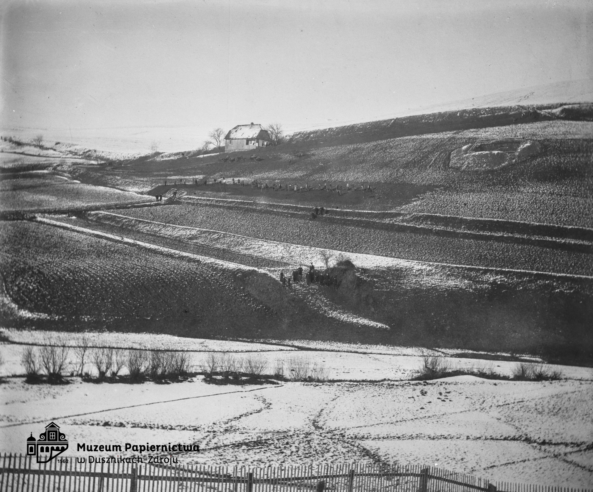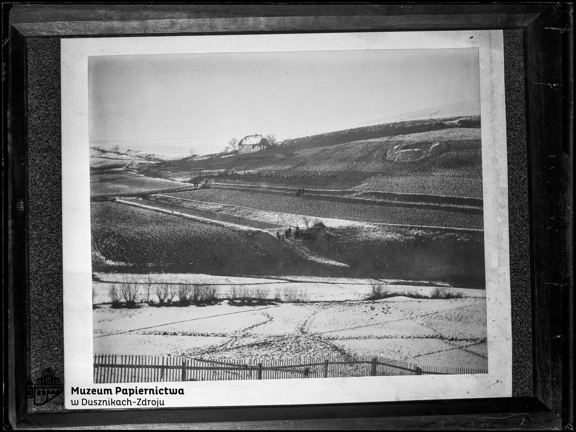 Zdjęcie na kliszy szklanej (negatyw), przedstawiające pola uprawne w okolicy Bad Reinerz (Duszniki-Zdrój), na drugim planie dom. Z kolekcji Ryszarda Grzelakowskiego. |