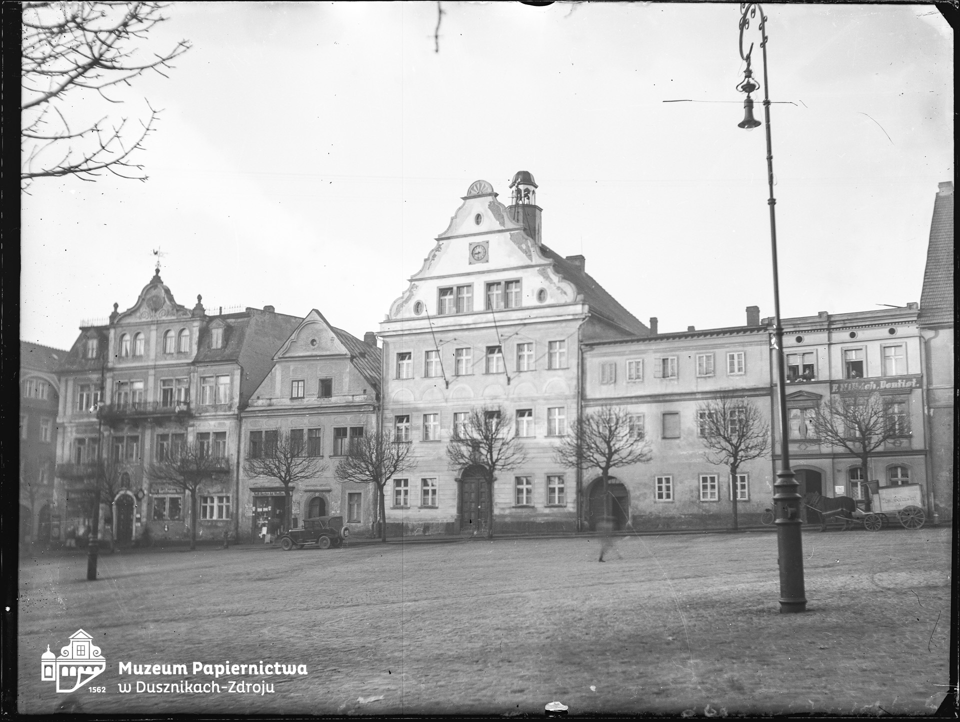 Zdjęcie na kliszy szklanej (negatyw), przedstawiające południowo-zachodnią pierzeję rynku z widokiem na ratusz w Bad Reinerz (Duszniki-Zdrój) Z kolekcji Ryszarda Grzelakowskiego. |