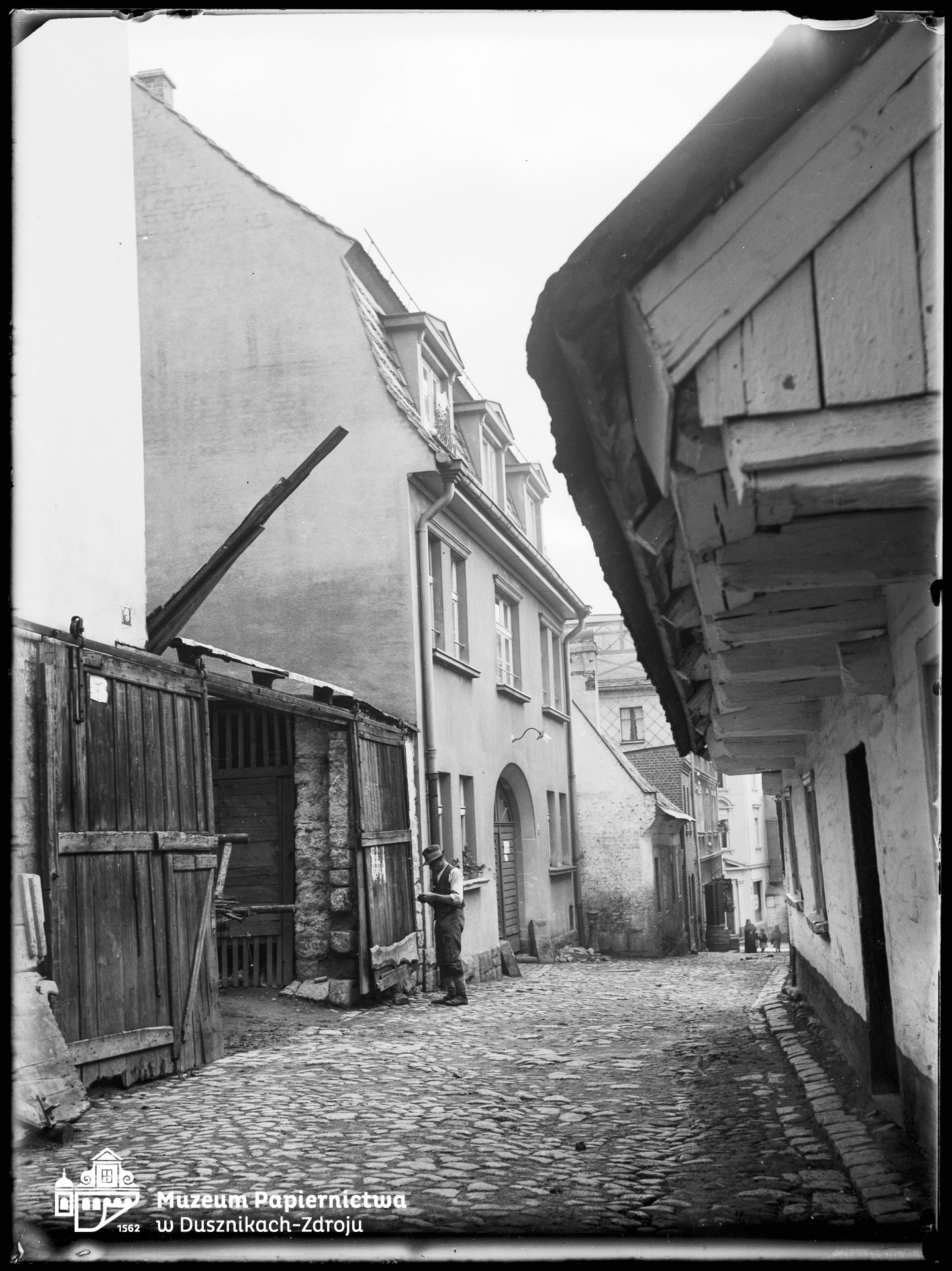 Zdjęcie na kliszy szklanej (negatyw), przedstawiające ulicę Schlosserstrasse (obecnie ul. Zamkowa) w kierunku Badestrasse (obecnej ul. Mickiewicza) w Bad Reinerz (Duszniki-Zdrój). Z kolekcji Ryszarda Grzelakowskiego. |