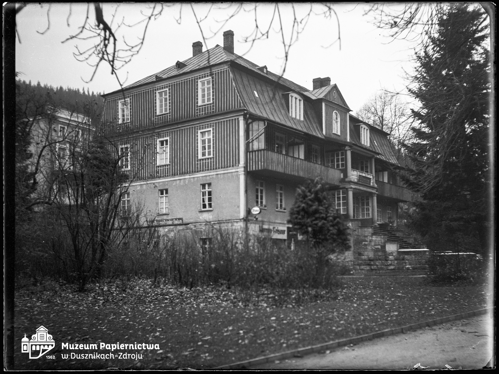 Zdjęcie na kliszy szklanej (negatyw), przedstawiające Villę Elysium w Bad Reinerz (Duszniki-Zdrój) przy obecnej ul. Chopina. Po II wojnie światowej obiekt nazwano „Lenino”. Rozebrano go po pożarze w latach 50/60. XX w. Z kolekcji Ryszarda Grzelakowskiego. |