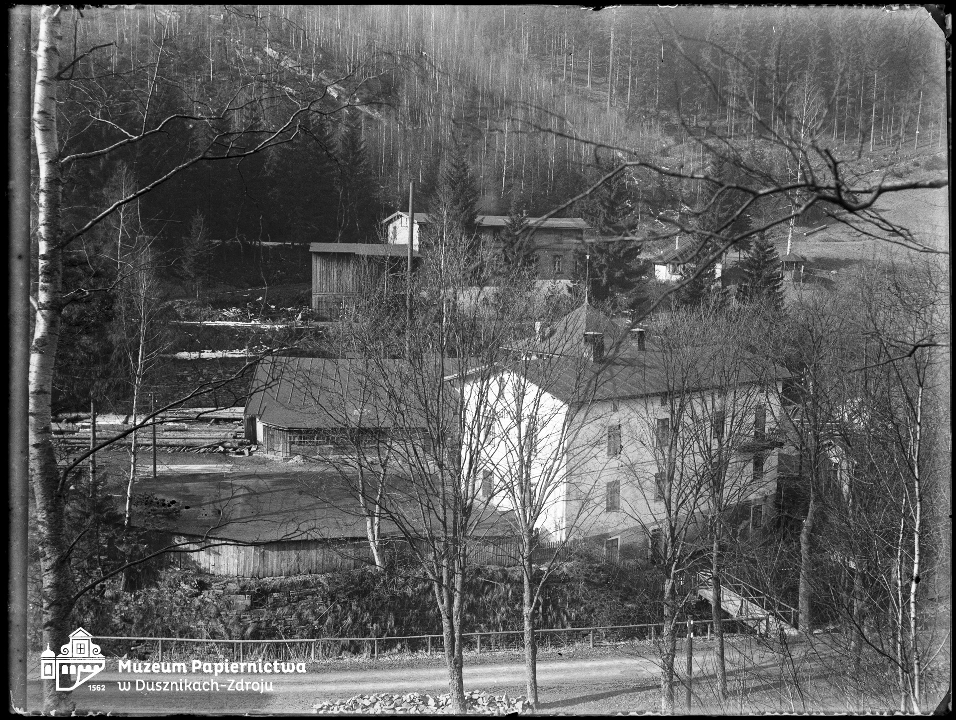 Zdjęcie na kliszy szklanej (negatyw), przedstawiające „Waldmühle” w Bad Reinerz (Duszniki-Zdrój, obecnie ul. Wojska Polskiego 22). |