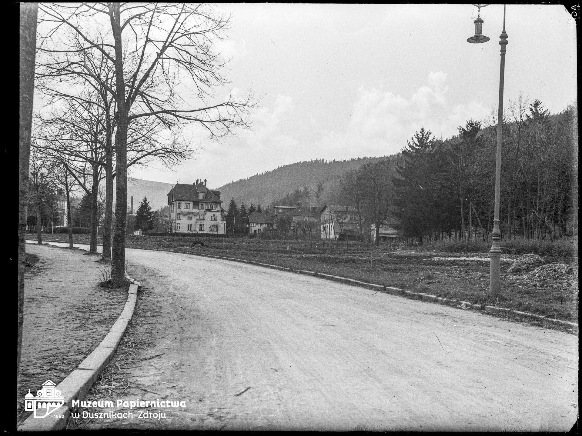 Zdjęcie na kliszy szklanej (negatyw), przedstawiające widok na Neue Villenstrasse (obecną ul. Zdrojową) i Villa Prinzess Charlotte (obecnie „Piastów Gród”) w Bad Reinerz (Duszniki-Zdrój). Z kolekcji Ryszarda Grzelakowskiego. |