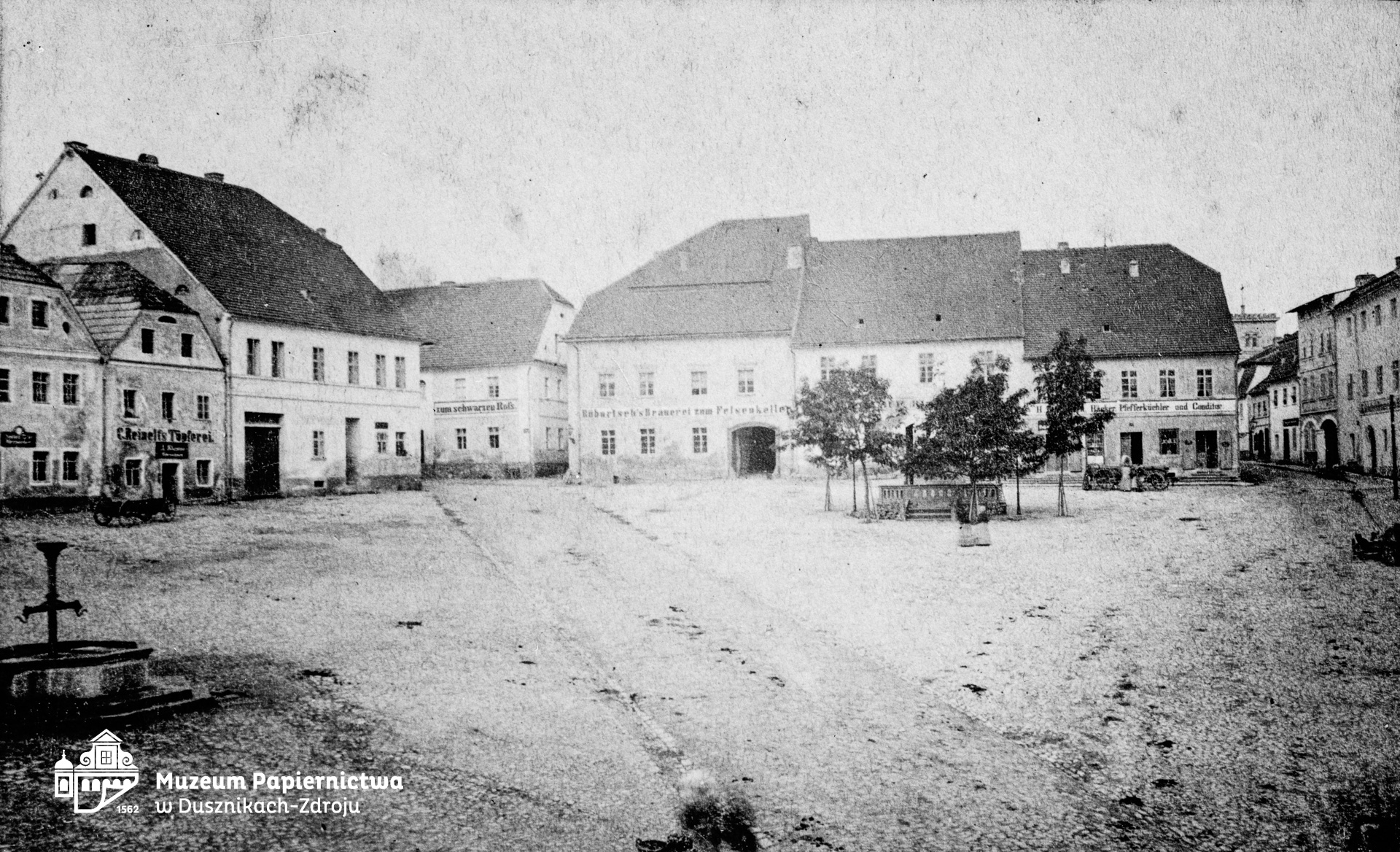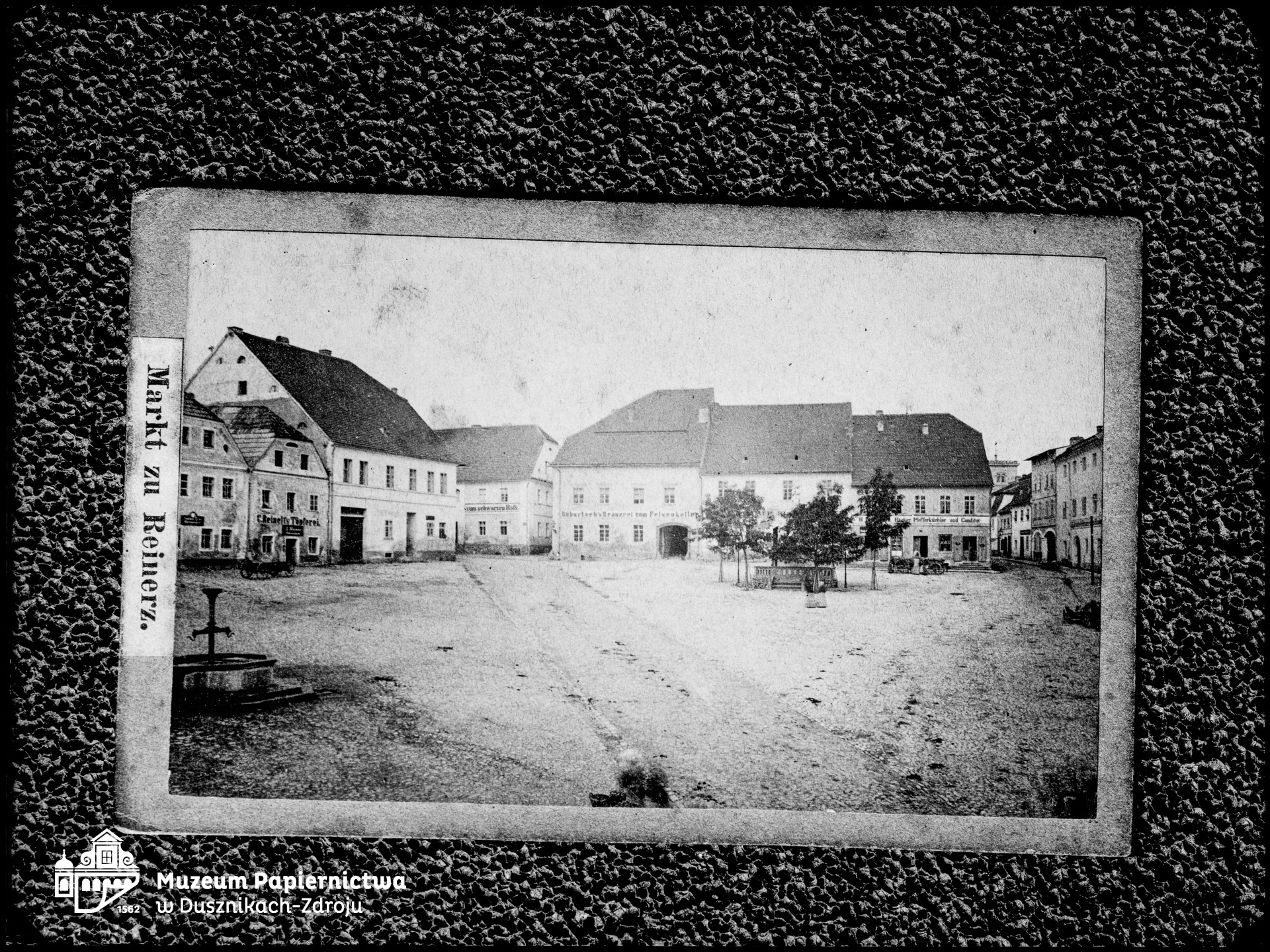 Zdjęcie na kliszy szklanej (negatyw) przedstawiające widok północno-zachodniej pierzei rynku w Bad Reinerz (Dusznikach-Zdroju), wyjście na dzisiejszą ul. J. Słowackiego Z kolekcji Ryszarda Grzelakowskiego. |