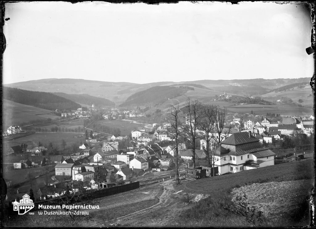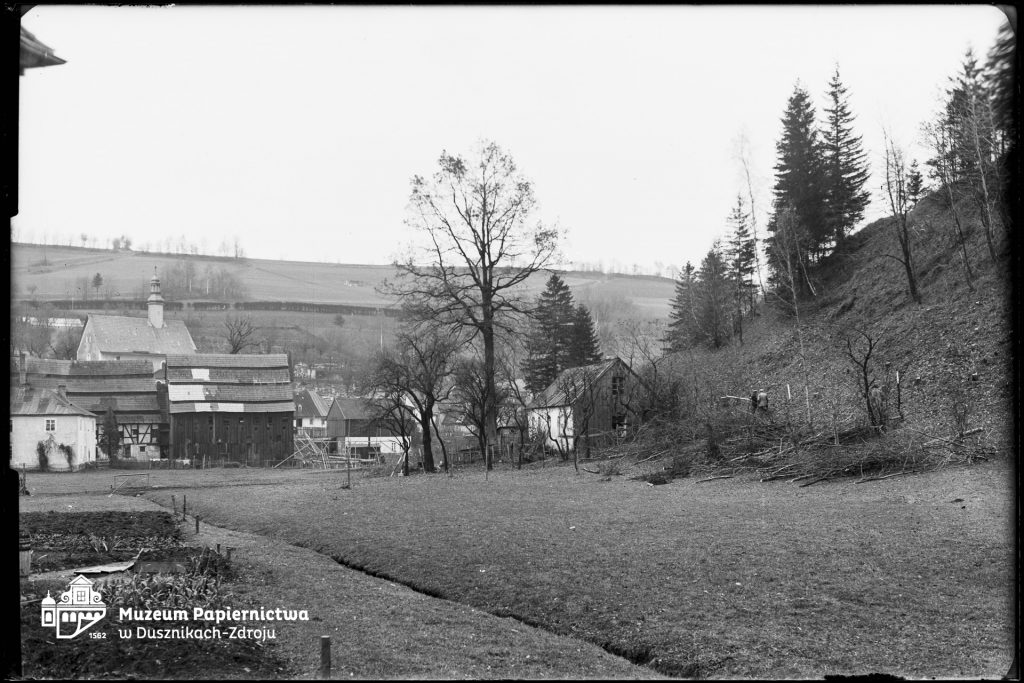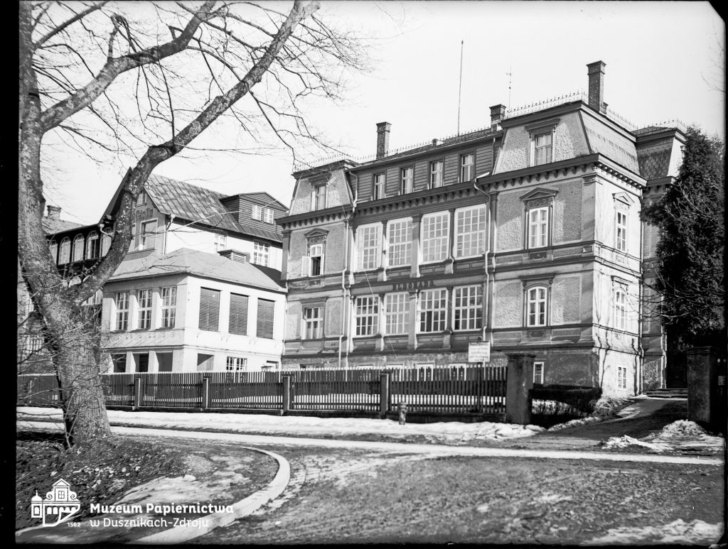 Zdjęcie przedstawiające młyn papierniczy w Bad Reinerz (Duszniki-Zdrój), widok na suszarnię i fragment głównego budynku