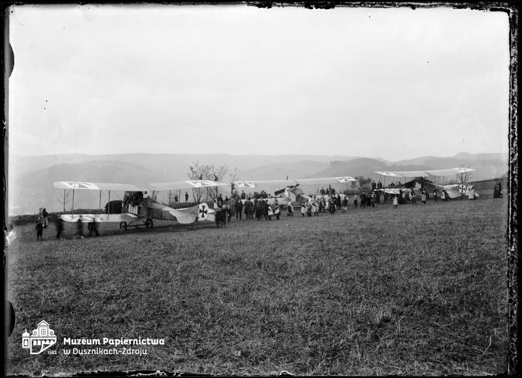 Zdjęcie przedstawiające 3 dwupłatowce niemieckie z okresu I wojny światowej stojące