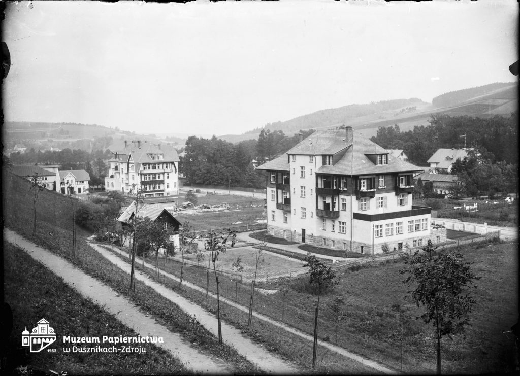 Zdjęcie przedstawiające widok na Neue Villenstrasse oraz ośrodki Villa Eben Ezer i Villa Prinzess Charlotte (dzisiejsze ośrodki Polonez i Piastów Gród) w Bad Reinerz (Duszniki-Zdrój)